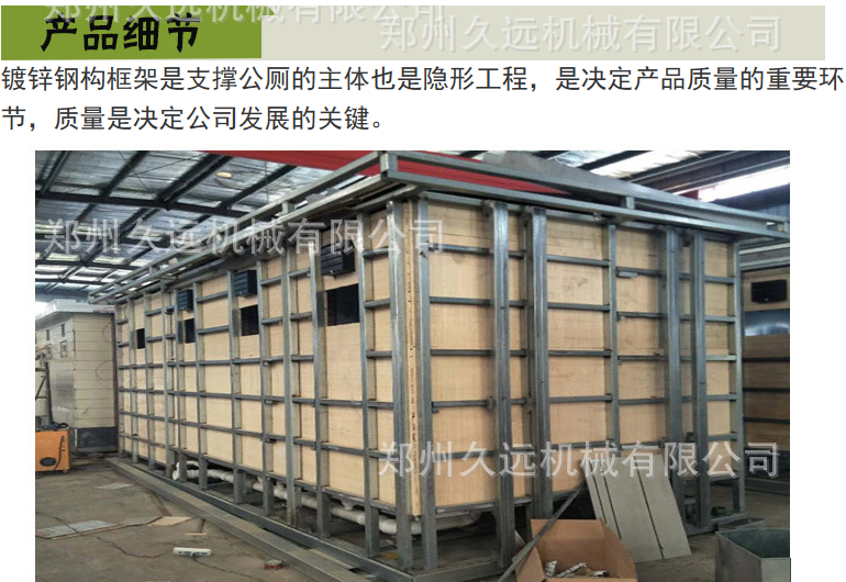 1、房體結(jié)構(gòu): 采用輕鋼龍骨結(jié)構(gòu),鋼材全部使用國家標(biāo)準(zhǔn)鍍鋅鋼材。根據(jù)房體的大小特選用國標(biāo)方管(50-100)焊接而成。鍍鋅管厚度為2.8mm,方管經(jīng)過除銹后進(jìn)行鍍鋅、防腐處理。這樣就會(huì)延長(zhǎng)廁所使用壽命。